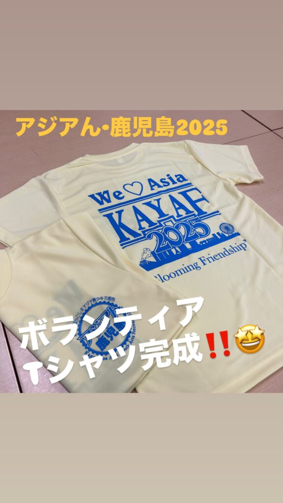 【WGボランティア活動報告~Tシャツお披露目~】 2025年9月27日 アジアんのTシャツが到着~!! 10/19(日)に行われる「アジアん・鹿児島」にて、中高短大学生のボランティアスタッフが、このTシャツを着てイベントを盛り上げてくれます!! ちなみに、、、このTシャツをどんな色で、どんなデザインにするかもボランティアスタッフ皆で案を出し合い、ブラッシュアップし、決めてくれています(^^♪ 今年は、ここ数年あまりなかった淡い下地の色合いに青文字が良い感じ♡ ホーム アジアん・鹿児島 トピックス 出演団体紹介 ボランティア・参加者募集