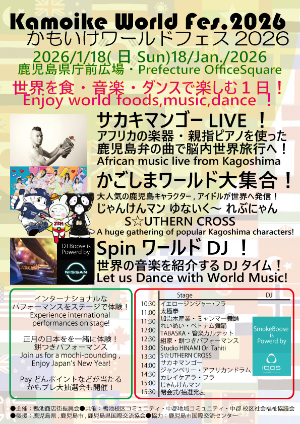 鴨池商店振興協会主催の「かもいけワールドフェス2026」が、1月18日(日)鹿児島県庁前広場で開催されます。