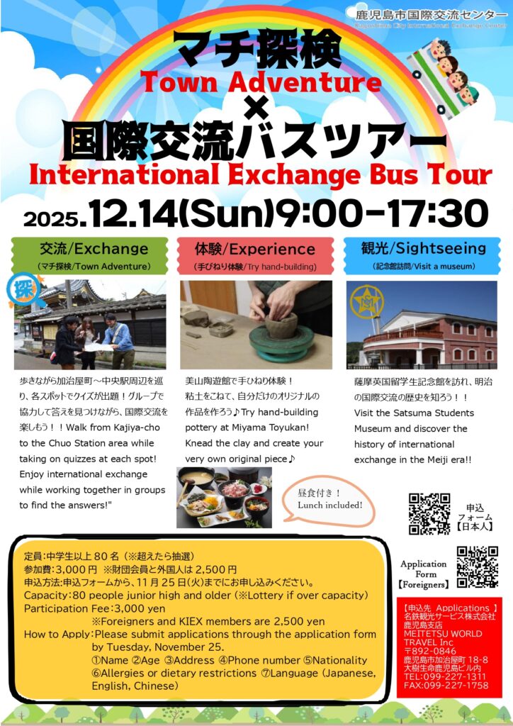 毎年、日本人・外国人住民が一緒に県内の史跡や観光施設を巡りながら、鹿児島への理解とお互いの交流を深めることを目的に実施しているバスツアー。今年は、マチ探検と国際交流バスツアーの2本立てで開催します!!加治屋町~中央駅を歩きながらクイズに答えたり、美山での手ひねり体験、薩摩英国留学生記念館を訪れ歴史を学んだりなど、内容盛りだくさんです!!さまざまな体験を通して、友達の輪を広げましょう!!皆様のご参加、お待ちしています♪
