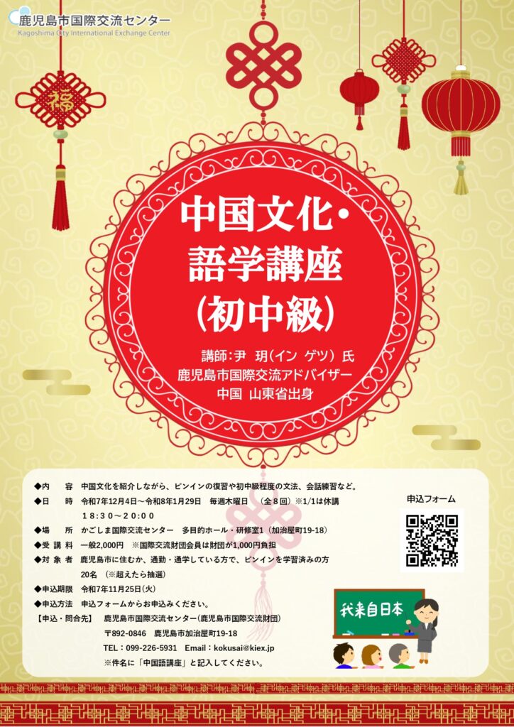 対象者 | 鹿児島市に住むか、通勤・通学している方で、ピンインを学習済みの方 |