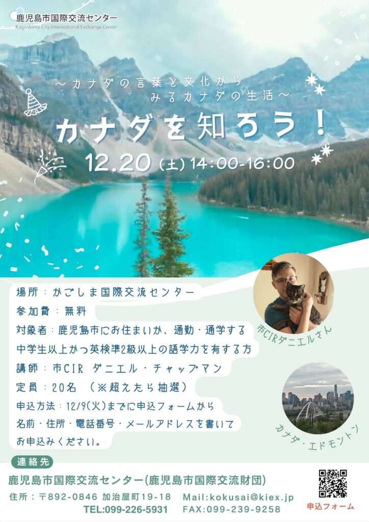 内容:新CIRの自己紹介や出身地についての紹介、専門分野の言語学の話を通じて、カナダの言語や文化に関する講座を実施します。