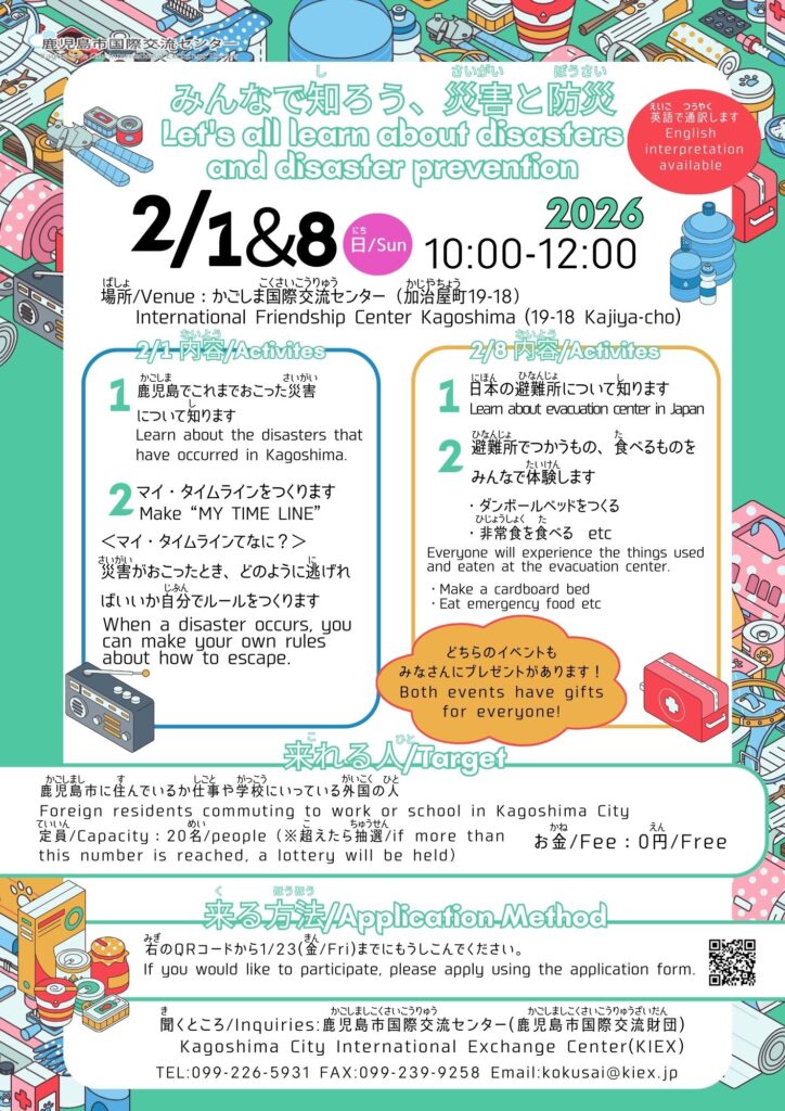 みなさん鹿児島で災害にあったときどうしますか?このイベントでは日本で災害にあったときどうすればいいか知ることができます。災害にあったときに使うものや食事の体験もできます。チラシを見てください。