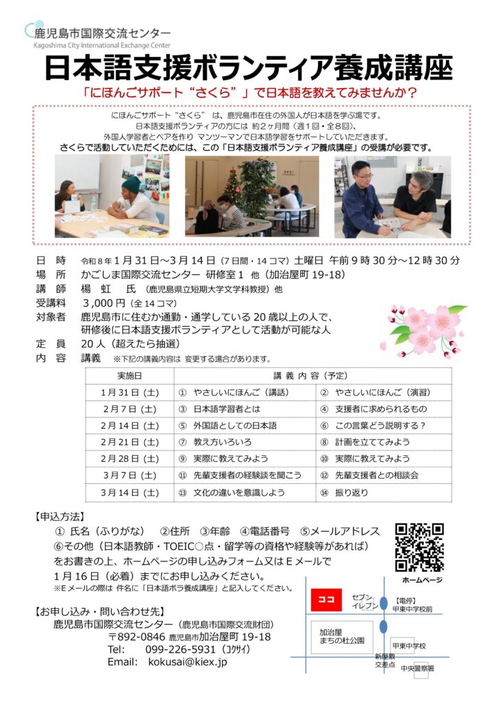 | 対象者 | 鹿児島市に住むか通勤・通学している20歳以上の人で、研修後に日本語支援ボランティアとして活動が可能な人 |