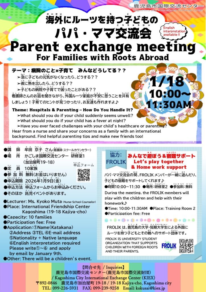 We are excited to host the second Parent Exchange Meeting for Families with Roots Abroad this year! This session’s theme is “Children’s Healthcare × Parenting.”