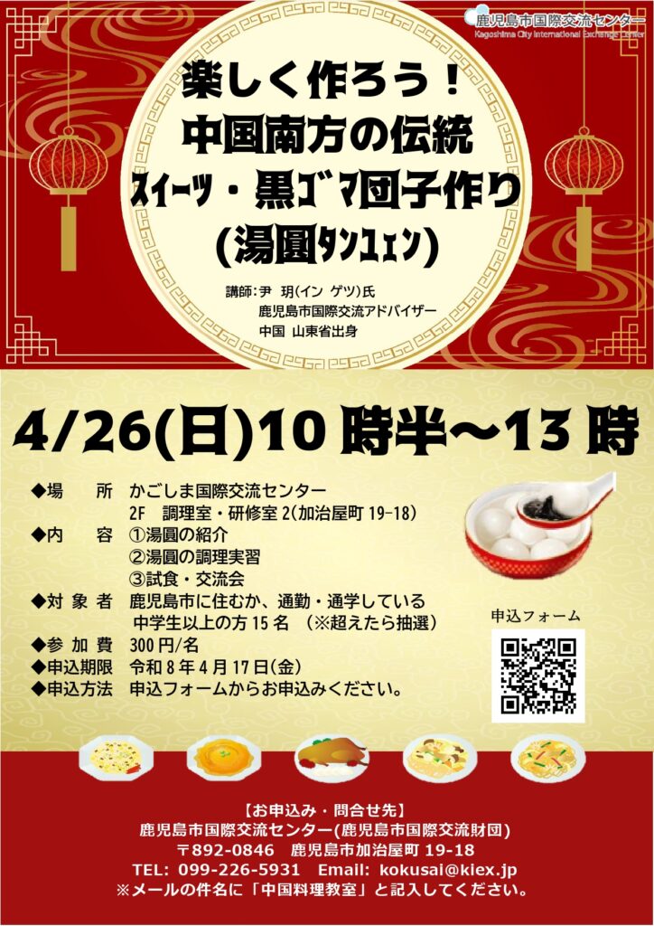 中国出身の鹿児島市国際交流アドバイザーが講師となり、「楽しく作ろう!中国南方の伝統スイーツ・黒ゴマ団子作り(湯圓タンユェン)」を開催します!!