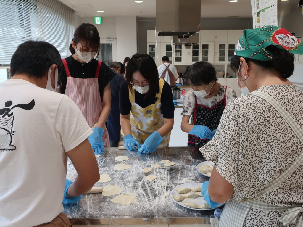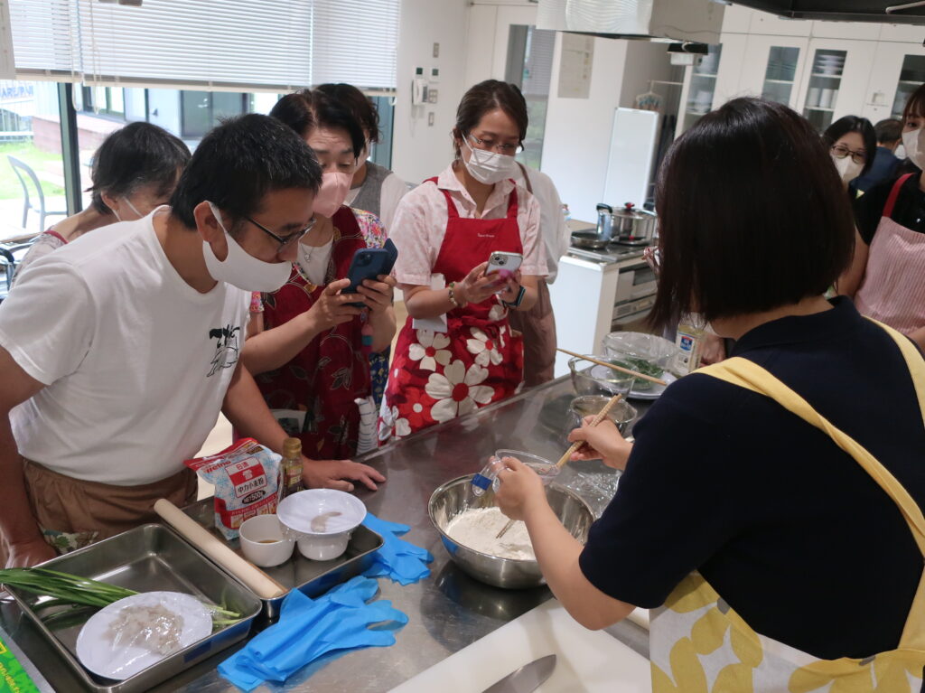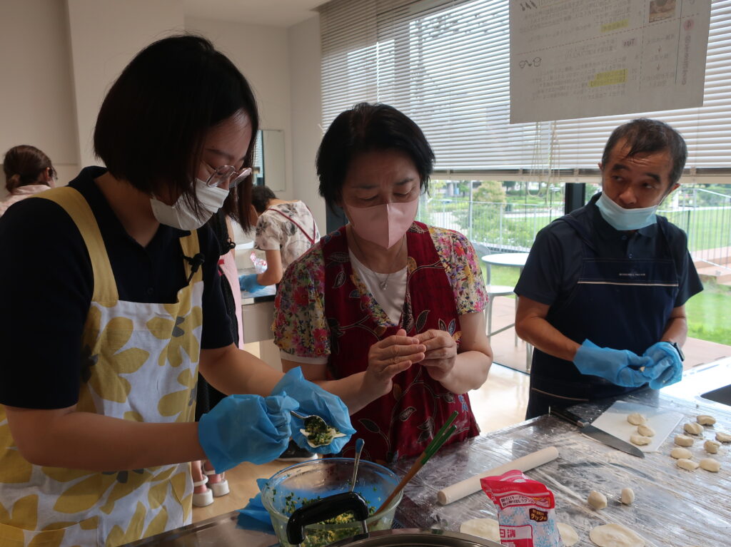 そして、文化紹介後は水餃子の皮づくりからスタートしました。講師から皮づくりのコツを教えてもらいながら、生地をこねて寝かす工程を繰返し、弾力のある生地が完成!同時進行で、今回はたっぷりのニラに卵やエビを混ぜた餡作りも行いました。続いて、生地を丸め、麺棒で伸ばし、餡を包む工程へ。最初は苦戦しながらも、包むうちにどんどん手際よく包むことができ、最後はたっぷりのお湯で茹であげ、黒酢や合せダレなど好みの調味料でモチモチプルプルの水餃子を味わいました♪